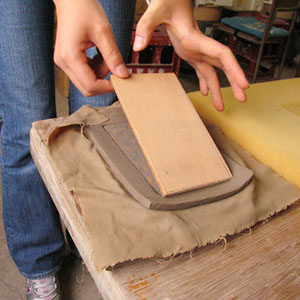 タタラ板を使い粘土をスライスする。