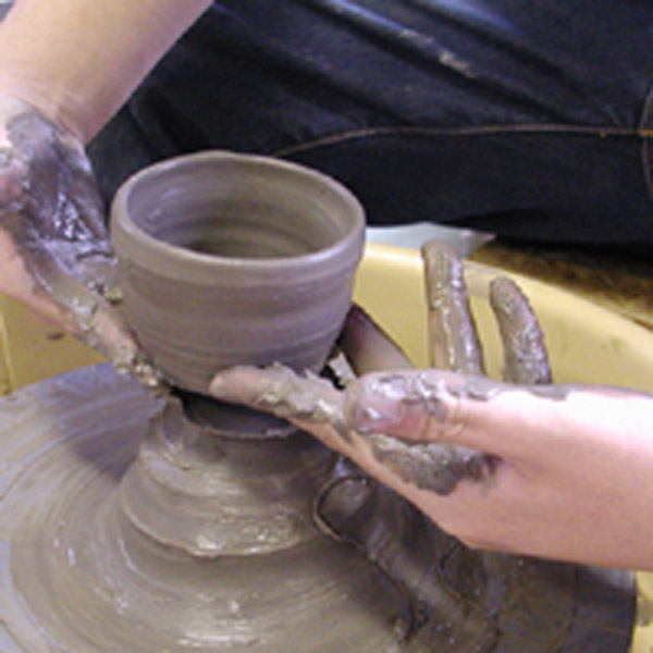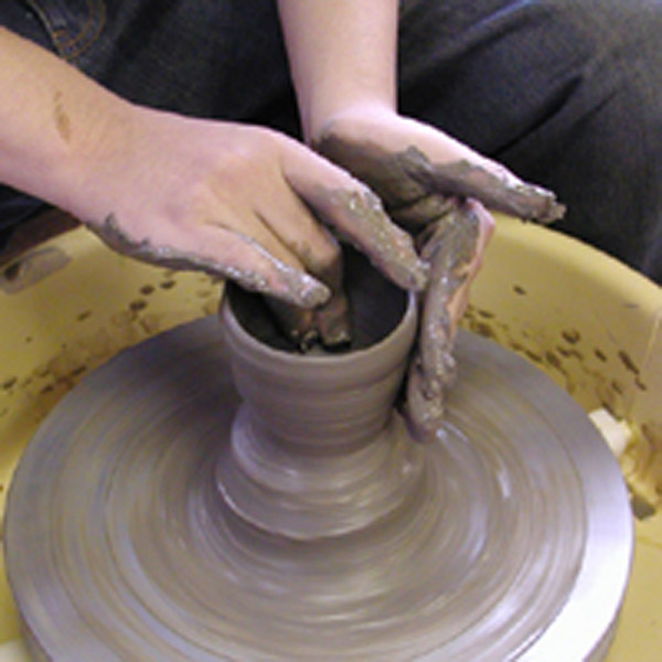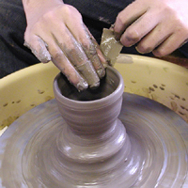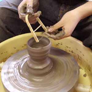 電動ロクロで作品をつくると、みるみるうちに粘土が伸びて、作品ができます。