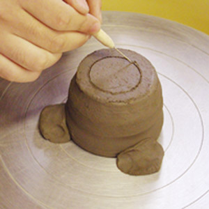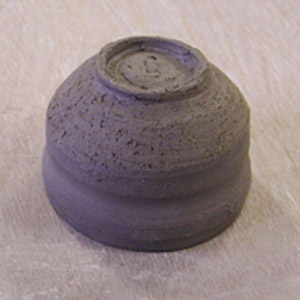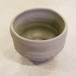 ロクロ成形後、乾燥させます。さわっても形がゆがまない程度(生乾き)になったら、作品の裏を削ります。削りは、できるだけ削る量が少なくなるように、ろくろ挽きのときにしっかりと粘土をのばし、一削り分を残して切り離すのがベストです。何度も練習してコツをつかんで下さい。