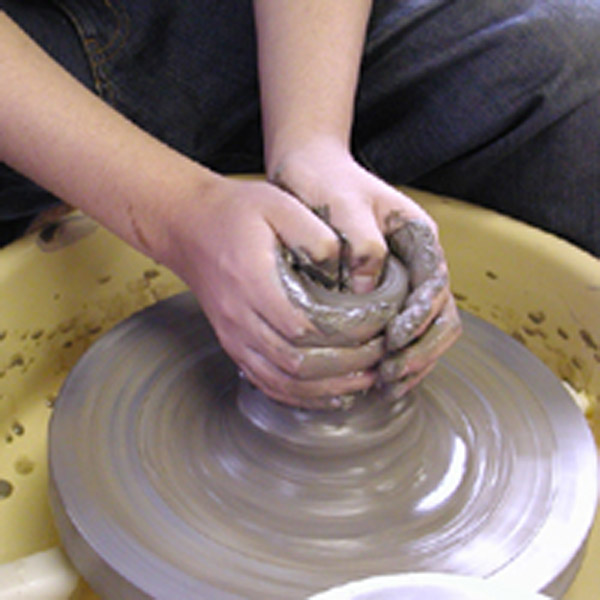 粘土をターンテーブル(時計回り・右回転)の上に置き、中心に入れる。